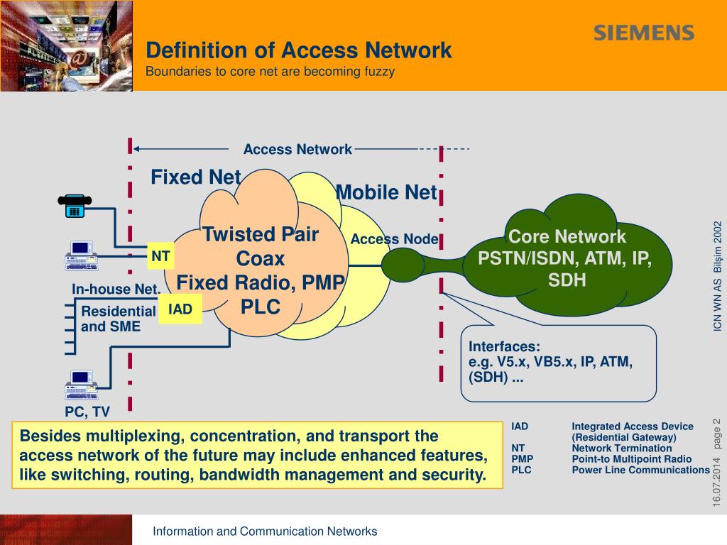 Access Network Definition of Access NetworkBoundaries to core net are becoming fuzzy Fixed Net Mobile Net Twisted Pair Coax Fixed Radio, PMP PLC Core Network PSTN/ISDN, ATM, IP, SDH Access Node NT In-house Net. IAD Residential and SME Interfaces: e.g. V5.x, VB5.x, IP, ATM, (SDH) ... PC, TV IAD Integrated Access Device (Residential Gateway) NT Network Termination PMP Point-to Multipoint Radio PLC Power Line Communications Besides multiplexing, concentration, and transport the access network of the future may include enhanced features, like switching, routing, bandwidth management and security.