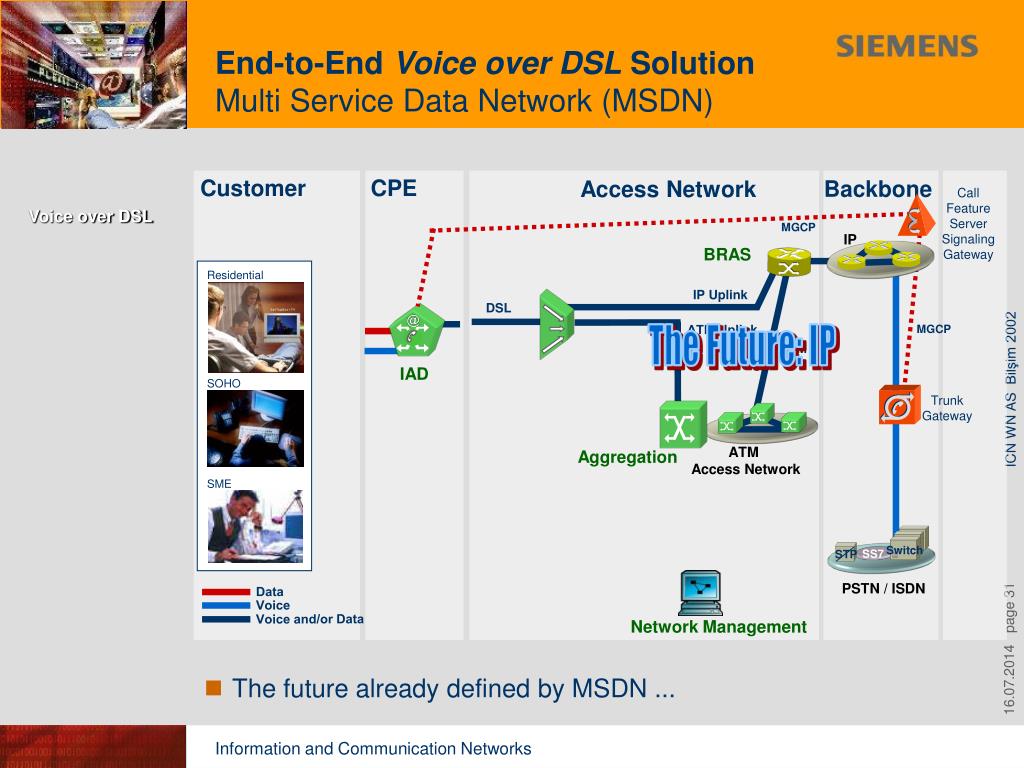 IP Uplink ATM Uplink The Future: IP ATM Switch ATM Access Network Aggregation STP SS7 PSTN / ISDN End-to-End Voice over DSL SolutionMulti Service Data Network (MSDN) Introduction Voice over DSL Fast Internet Access Video over DSL Access Network Summary Customer CPE Backbone Access Network Call Feature ServerSignaling Gateway MGCP IP BRAS Residential DSL MGCP IAD SOHO Trunk Gateway SME Data Voice Voice and/or Data Network Management • The future already defined by MSDN ...