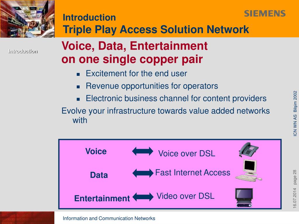 Triple Play Introduction Voice over DSL Fast Internet Access Video over DSL Access Network Summary Voice Voice over DSL Fast Internet Access Data Video over DSL Entertainment With Triple Play Solutions, you give added-value to your network.