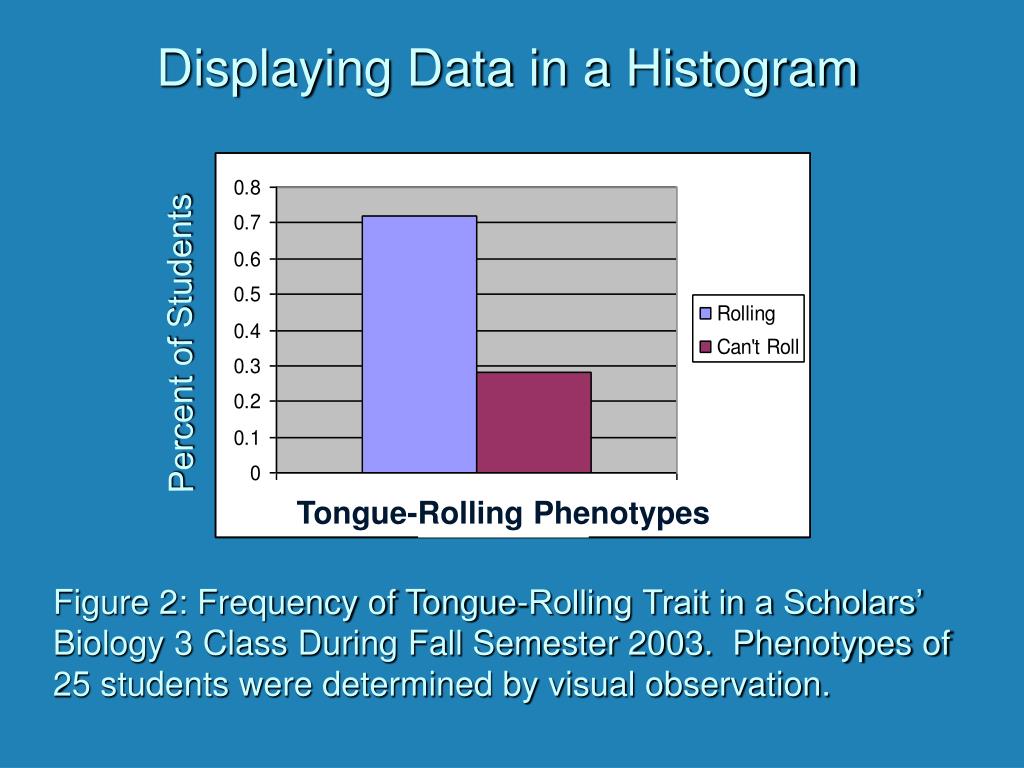 Displaying Data in a Histogram Percent of Students Tongue-Rolling Phenotypes Figure 2: Frequency of Tongue-Rolling Trait in a Scholars’ Biology 3 Class During Fall Semester 2003. Phenotypes of 25 students were determined by visual observation.