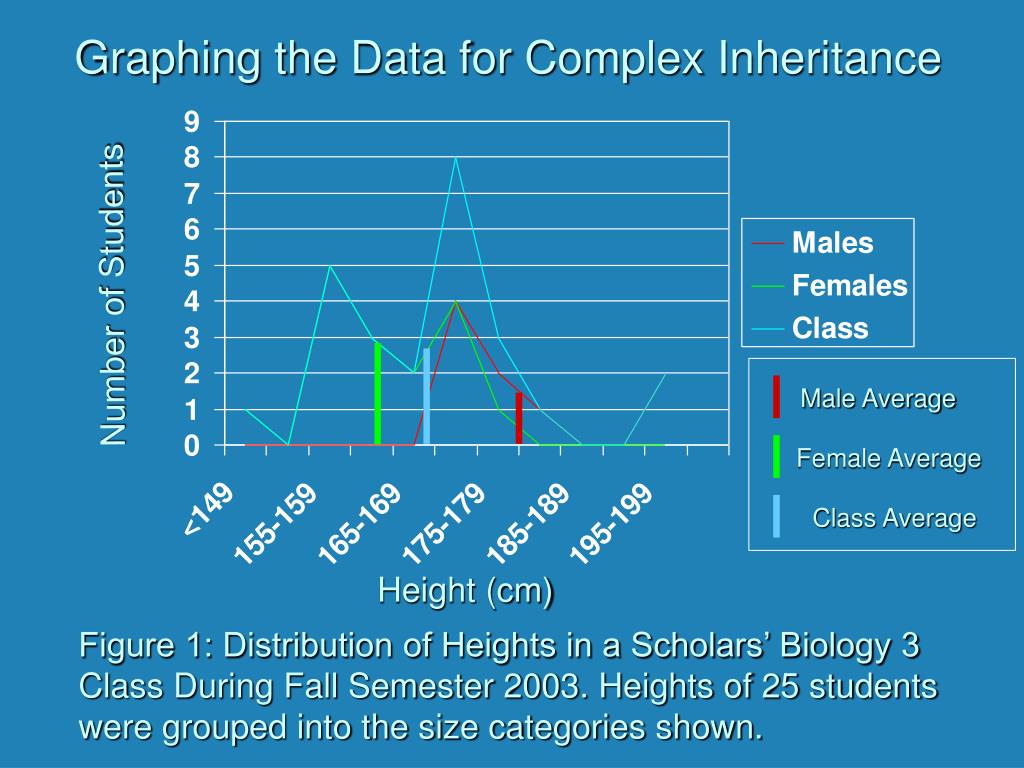 Graphing the Data for Complex Inheritance Number of Students Male Average Female Average Class Average Height (cm) Figure 1: Distribution of Heights in a Scholars’ Biology 3 Class During Fall Semester 2003. Heights of 25 students were grouped into the size categories shown.