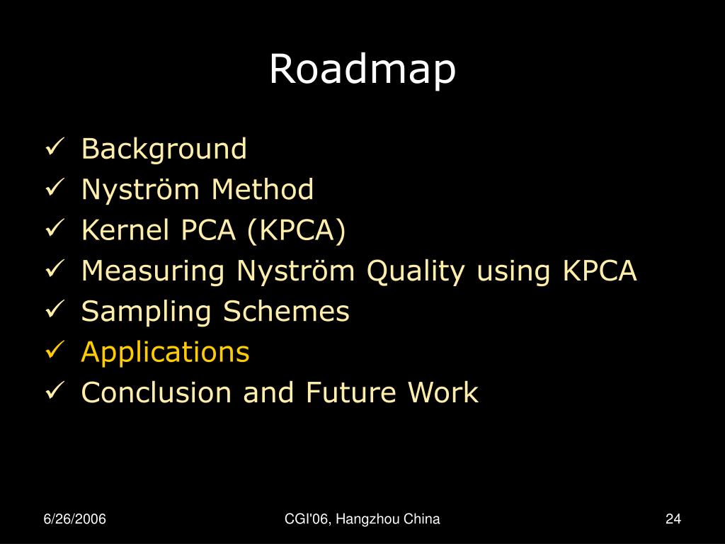 Roadmap • Background • Nyström Method • Kernel PCA (KPCA) • Measuring Nyström Quality using KPCA • Sampling Schemes • Applications • Conclusion and Future Work CGI'06, Hangzhou China