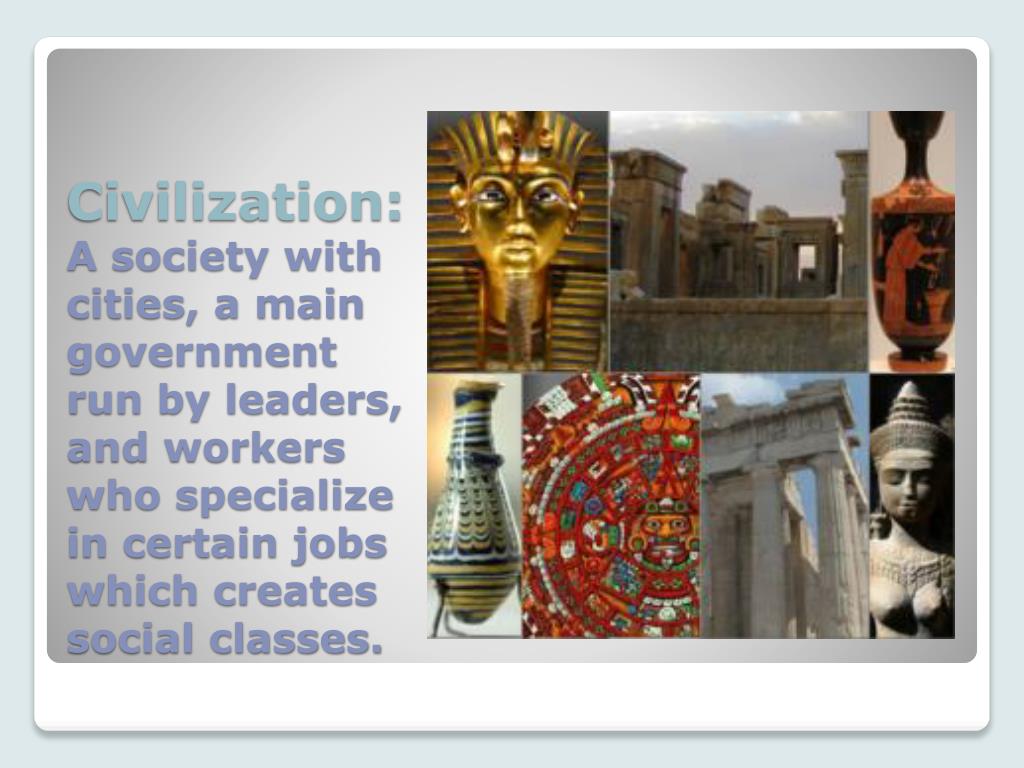 Civilization:A society with cities, a main government run by leaders, and workers who specialize in certain jobs which creates social classes.