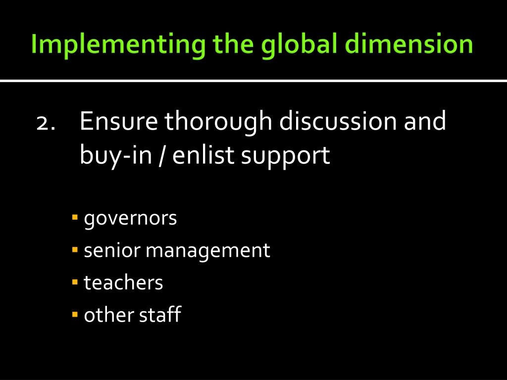 Implementing the global dimension 2. Ensure thorough discussion and buy-in / enlist support • governors • senior management • teachers • other staff