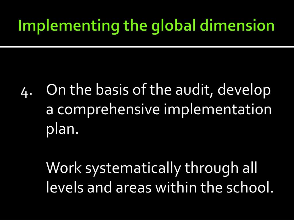 Implementing the global dimension 4. On the basis of the audit, develop a comprehensive implementation plan. Work systematically through all levels and areas within the school.