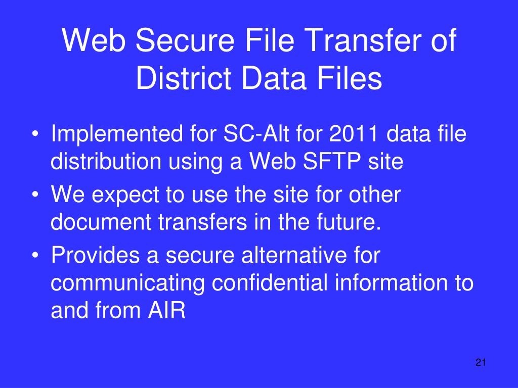 Web Secure File Transfer of District Data Files • Implemented for SC-Alt for 2011 data file distribution using a Web SFTP site • We expect to use the site for other document transfers in the future. • Provides a secure alternative for communicating confidential information to and from AIR