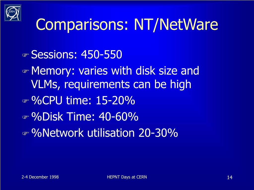 Comparisons: NT/NetWare • Sessions: 450-550 • Memory: varies with disk size and VLMs, requirements can be high • %CPU time: 15-20% • %Disk Time: 40-60% • %Network utilisation 20-30% HEPNT Days at CERN