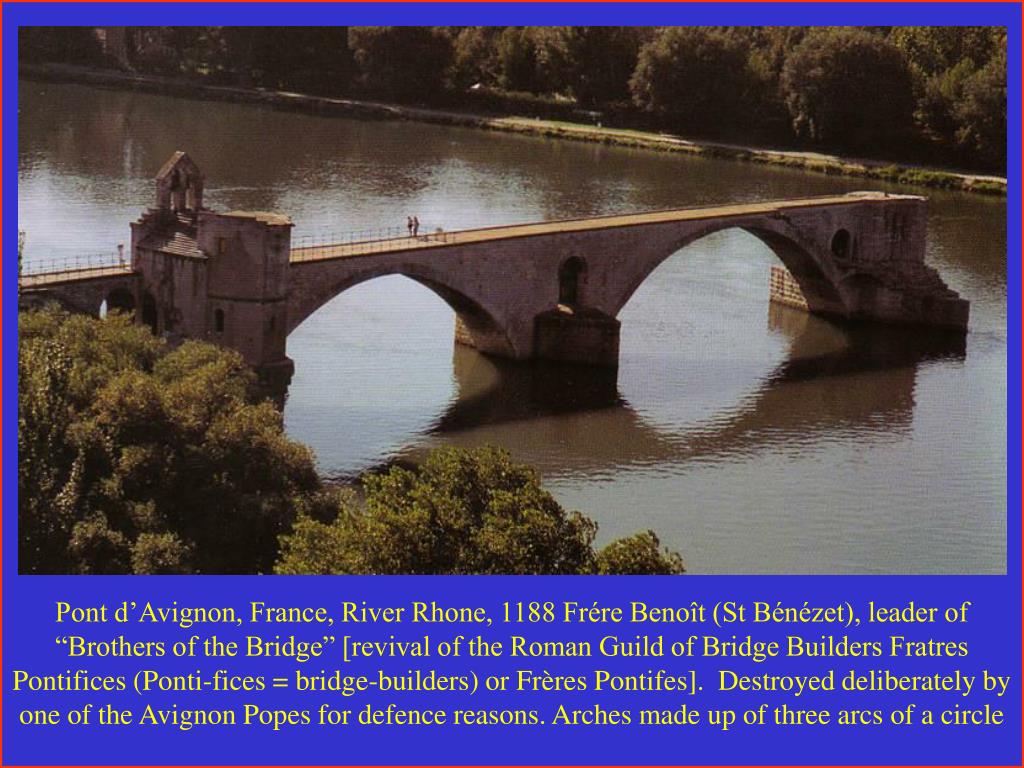 Pont d’Avignon, France, River Rhone, 1188 Frére Benoît (St Bénézet), leader of “Brothers of the Bridge” [revival of the Roman Guild of Bridge Builders Fratres Pontifices (Ponti-fices = bridge-builders) or Frères Pontifes]. Destroyed deliberately by one of the Avignon Popes for defence reasons. Arches made up of three arcs of a circle