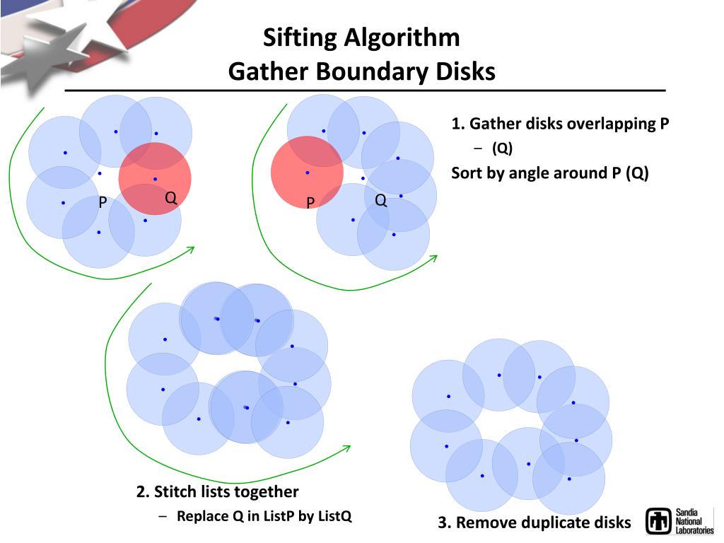 Sifting AlgorithmGather Boundary Disks 1. Gather disks overlapping P • (Q) Sort by angle around P (Q) Q Q P P 2. Stitch lists together • Replace Q in ListP by ListQ 3. Remove duplicate disks