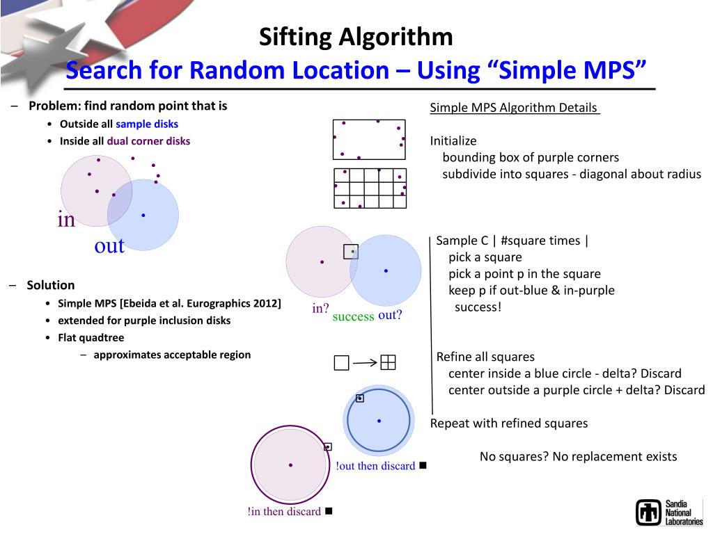 Sifting AlgorithmSearch for Random Location – Using “Simple MPS” • Problem: find random point that is • Outside all sample disks • Inside all dual corner disks Simple MPS Algorithm Details Initialize bounding box of purple corners subdivide into squares - diagonal about radius Sample C | #square times | pick a square pick a point p in the square keep p if out-blue & in-purple success! Refine all squares center inside a blue circle - delta? Discard center outside a purple circle + delta? Discard Repeat with refined squares No squares? No replacement exists in out • Solution • Simple MPS [Ebeida et al. Eurographics 2012] • extended for purple inclusion disks • Flat quadtree • approximates acceptable region in? out? success !out then discard !in then discard