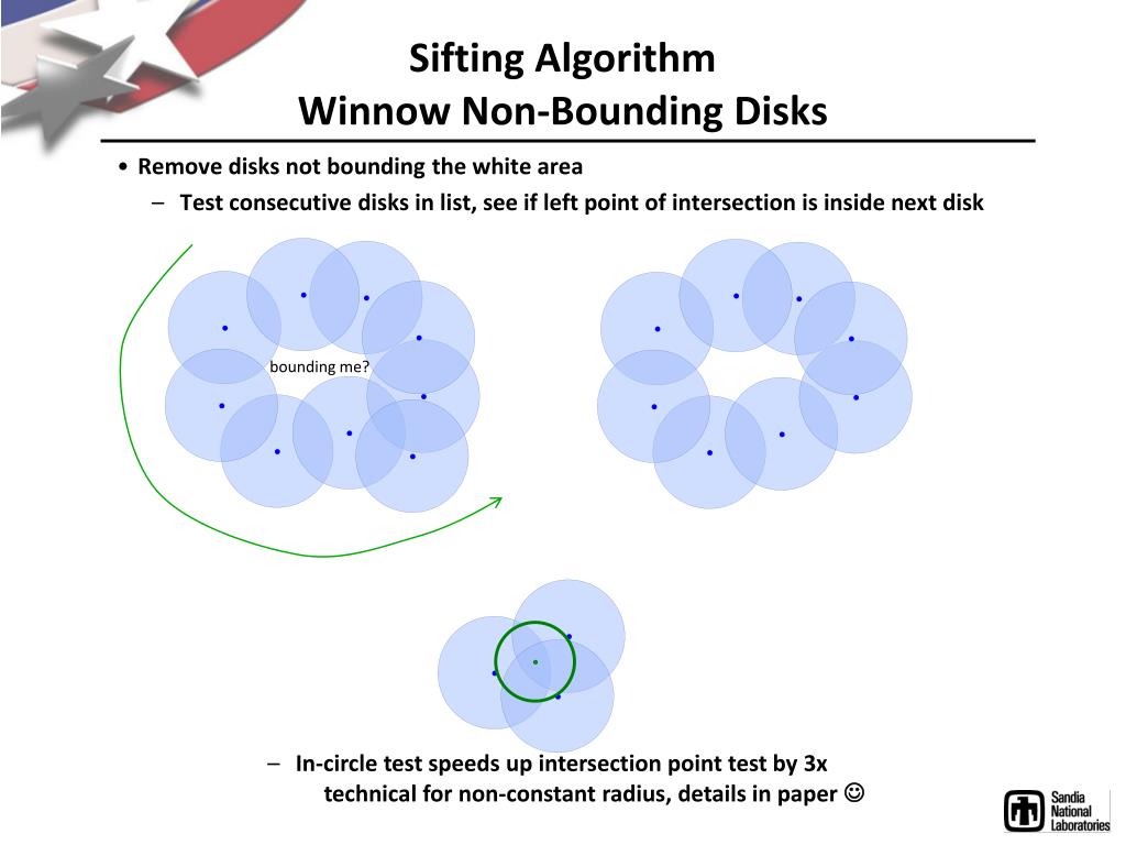 Sifting AlgorithmWinnow Non-Bounding Disks • Remove disks not bounding the white area • Test consecutive disks in list, see if left point of intersection is inside next disk bounding me? • In-circle test speeds up intersection point test by 3x technical for non-constant radius, details in paper