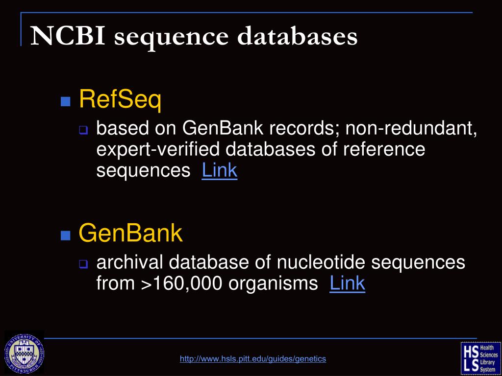 NCBI sequence databases • RefSeq • based on GenBank records; non-redundant, expert-verified databases of reference sequences Link • GenBank • archival database of nucleotide sequences from >160,000 organisms Link http://www.hsls.pitt.edu/guides/genetics