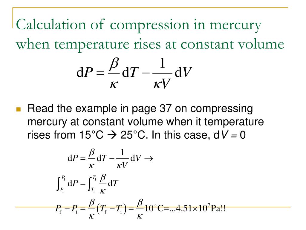 Calculation of compression in mercury when temperature rises at constant volume • Read the example in page 37 on compressing mercury at constant volume when it temperature rises from 15°C 25°C. In this case, dV = 0