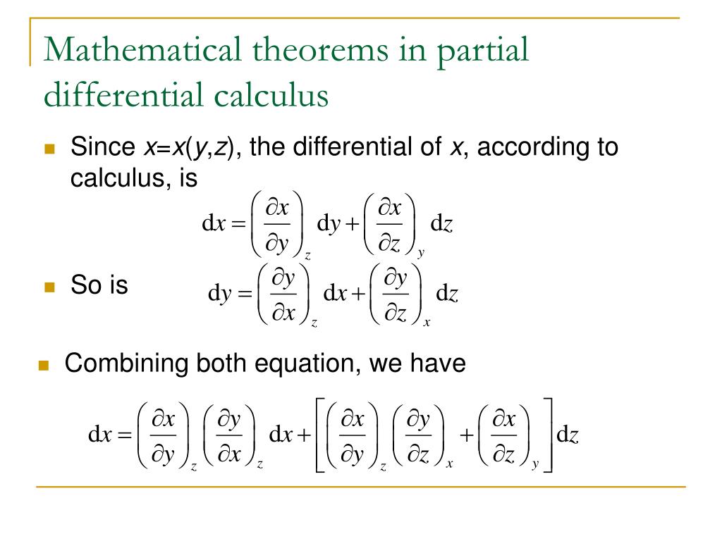 Mathematical theorems in partial differential calculus • Since x=x(y,z), the differential of x, according to calculus, is • So is • Combining both equation, we have