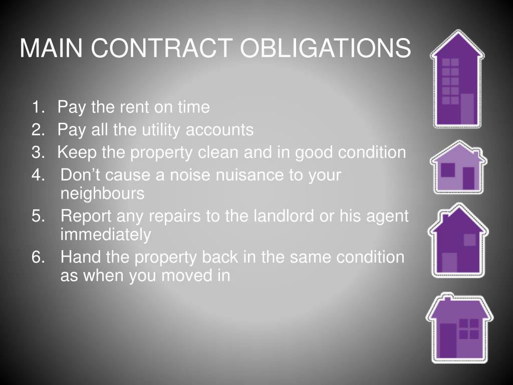 MAIN CONTRACT OBLIGATIONS • Pay the rent on time • Pay all the utility accounts • Keep the property clean and in good condition 4. Don’t cause a noise nuisance to your neighbours • Report any repairs to the landlord or his agent immediately 6. Hand the property back in the same condition as when you moved in