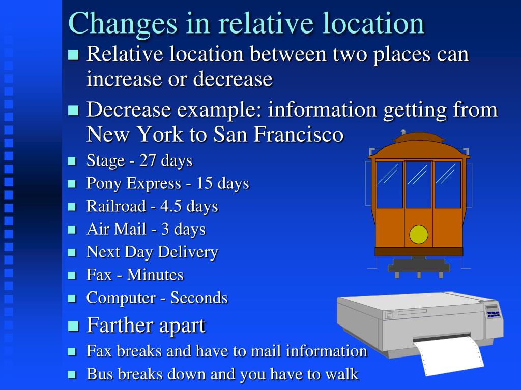 Changes in relative location • Relative location between two places can increase or decrease • Decrease example: information getting from New York to San Francisco • Stage - 27 days • Pony Express - 15 days • Railroad - 4.5 days • Air Mail - 3 days • Next Day Delivery • Fax - Minutes • Computer - Seconds • Farther apart • Fax breaks and have to mail information • Bus breaks down and you have to walk