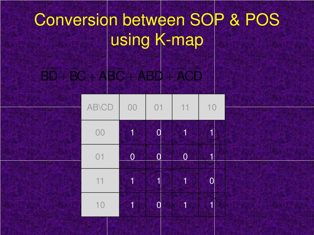 Conversion between SOP & POS using K-map • Groups of 1s represents SOP expression • Groups of 0s represents POS expression