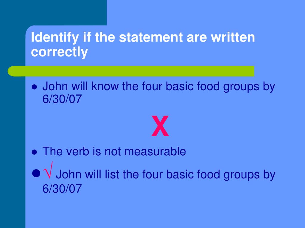 Identify if the statement are written correctly • John will know the four basic food groups by 6/30/07 X • The verb is not measurable • √John will list the four basic food groups by 6/30/07