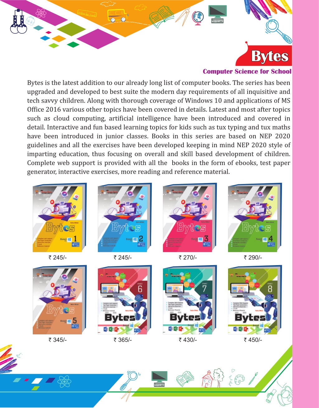 Bytes Bytes Bytes Bytes is the latest addition to our already long list of computer books. The series has been such as cloud computing, artificial intelligence have been introduced and covered in imparting education, thus focusing on overall and skill based development of children. Computer Science for School upgraded and developed to best suite the modern day requirements of all inquisitive and detail. Interactive and fun based learning topics for kids such as tux typing and tux maths Complete web support is provided with all the books in the form of ebooks, test paper tech savvy children. Along with thorough coverage of Windows 10 and applications of MS have been introduced in junior classes. Books in this series are based on NEP 2020 generator, interactive exercises, more reading and reference material. Office 2016 various other topics have been covered in details. Latest and most after topics guidelines and all the exercises have been developed keeping in mind NEP 2020 style of ` 245/- ` 245/- ` 270/- ` 290/- ` 345/- ` 365/- ` 430/- ` 450/-