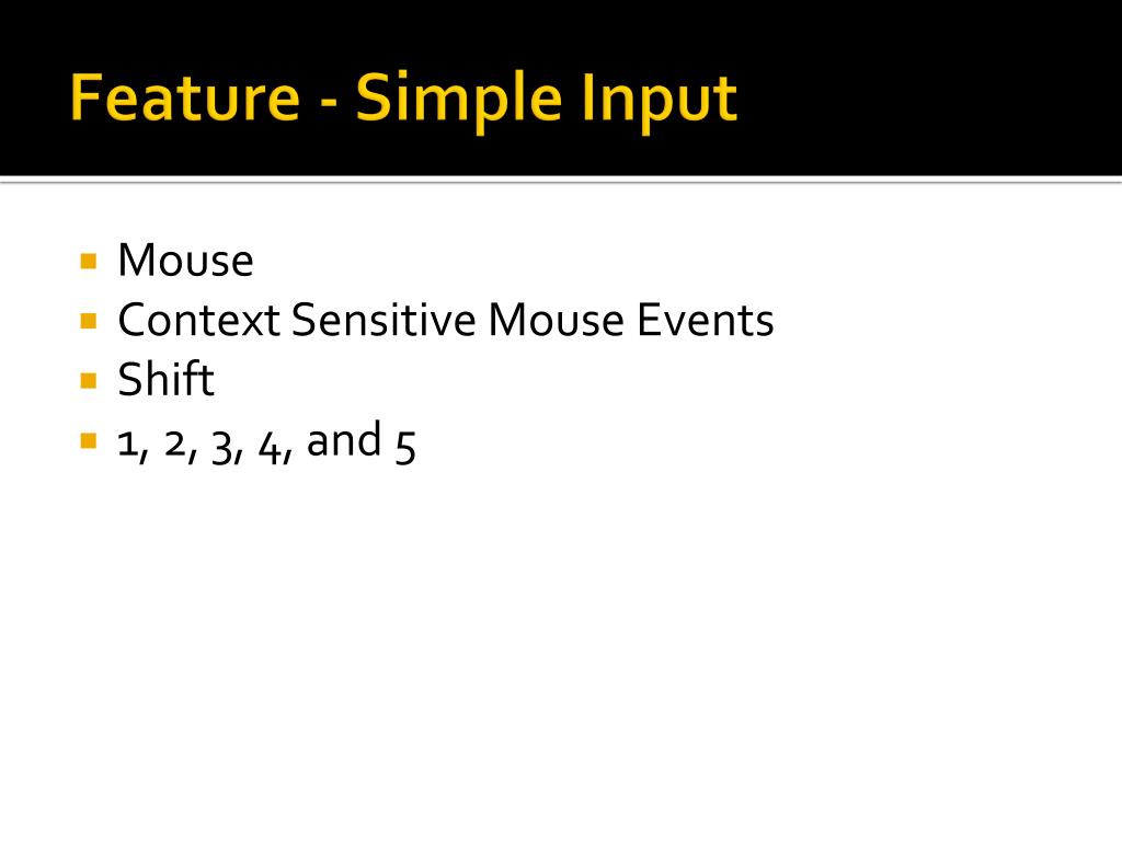 Feature - Simple Input • Mouse • Context Sensitive Mouse Events • Shift • 1, 2, 3, 4, and 5