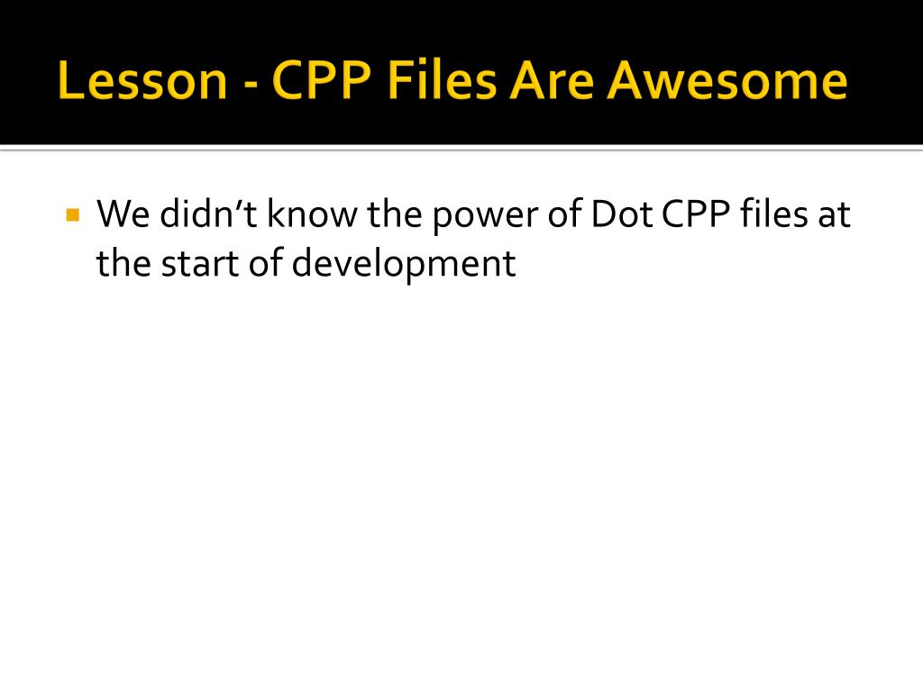 Lesson - CPP Files Are Awesome • We didn’t know the power of Dot CPP files at the start of development