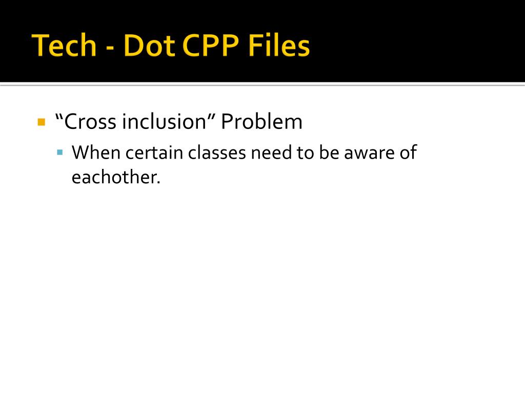 Tech - Dot CPP Files • “Cross inclusion” Problem • When certain classes need to be aware of eachother.