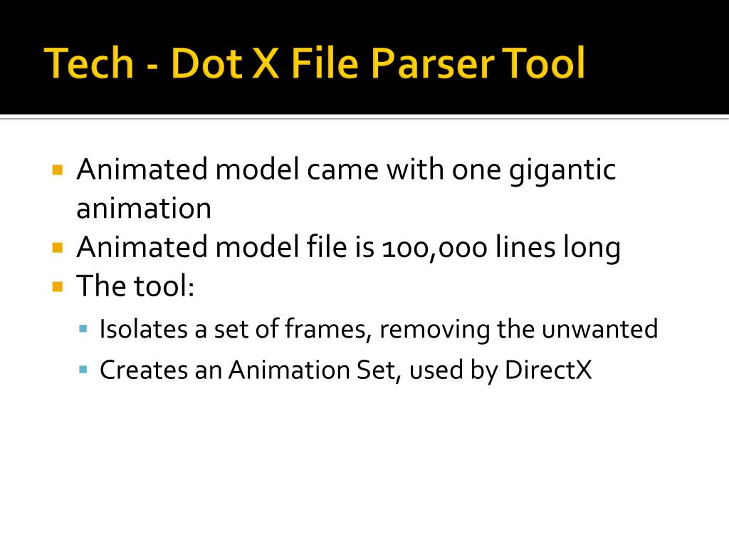 Tech - Dot X File Parser Tool • Animated model came with one gigantic animation • Animated model file is 100,000 lines long • The tool: • Isolates a set of frames, removing the unwanted • Creates an Animation Set, used by DirectX