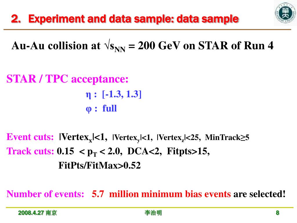 2.Experiment and data sample: data sample Au-Au collision at √sNN = 200 GeV on STAR of Run 4 STAR / TPC acceptance: η : [-1.3, 1.3] φ : full Event cuts:|Vertexx|<1, |Vertexy|<1, |Vertexz|<25, MinTrack≥5 Track cuts:0.15 < pT < 2.0, DCA<2, Fitpts>15, FitPts/FitMax>0.52 Number of events:5.7 million minimum bias eventsare selected! 李治明