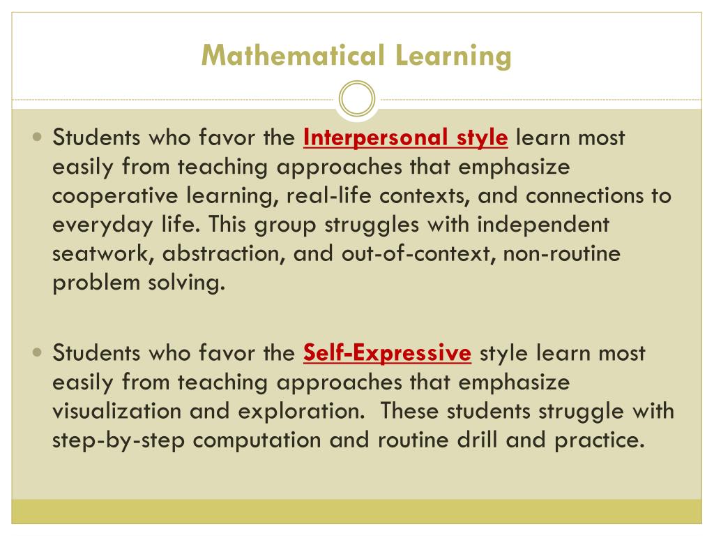 Mathematical Learning Students who favor the Interpersonal stylelearn most easily from teaching approaches that emphasize cooperative learning, real-life contexts, and connections to everyday life. This group struggles with independent seatwork, abstraction, and out-of-context, non-routine problem solving. Students who favor the Self-Expressive style learn most easily from teaching approaches that emphasize visualization and exploration. These students struggle with step-by-step computation and routine drill and practice.