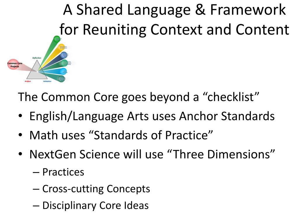 A Shared Language & Framework for Reuniting Context and Content The Common Core goes beyond a “checklist” • English/Language Arts uses Anchor Standards • Math uses “Standards of Practice” • NextGen Science will use “Three Dimensions” • Practices • Cross-cutting Concepts • Disciplinary Core Ideas