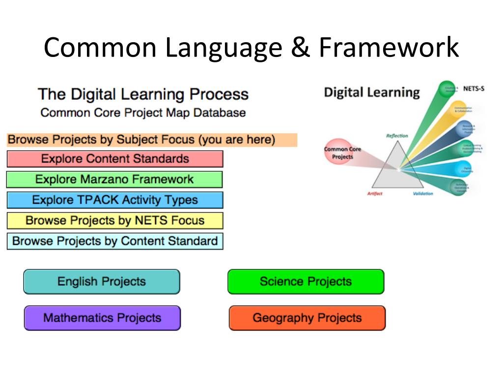 The Digital Learning Process Common Core Database A practical framework for systematically developing TPACK focused on the Common Core : • each inquiry driven project focuses on all six NETS-S • each NETS-S strengthens the relevant Common Core (ELA and Math) Standard • each Standard is linked to the specific TPACK activity type to support the subject • each activity is paired with the applicable Marzano instructional strategy • each activity is paired with the applicable Intel Teach rubric for formative assessment of student work • the database contains all K-12 Common Core Standards, as well as Science and Geography standards, making it adaptable by any teacher at any level