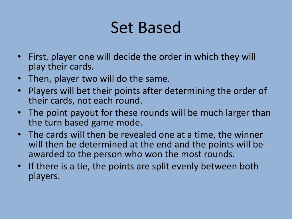 Set Based • First, player one will decide the order in which they will play their cards. • Then, player two will do the same. • Players will bet their points after determining the order of their cards, not each round. • The point payout for these rounds will be much larger than the turn based game mode. • The cards will then be revealed one at a time, the winner will then be determined at the end and the points will be awarded to the person who won the most rounds. • If there is a tie, the points are split evenly between both players.