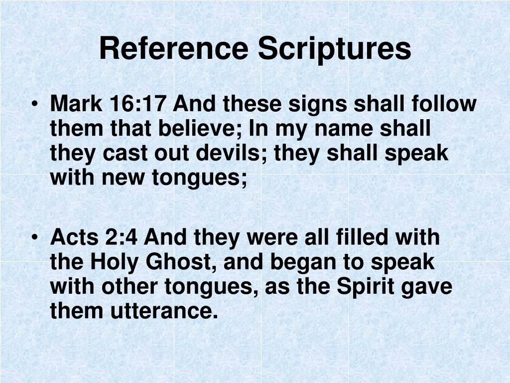 Reference Scriptures • Mark 16:17 And these signs shall follow them that believe; In my name shall they cast out devils; they shall speak with new tongues; • Acts 2:4 And they were all filled with the Holy Ghost, and began to speak with other tongues, as the Spirit gave them utterance.