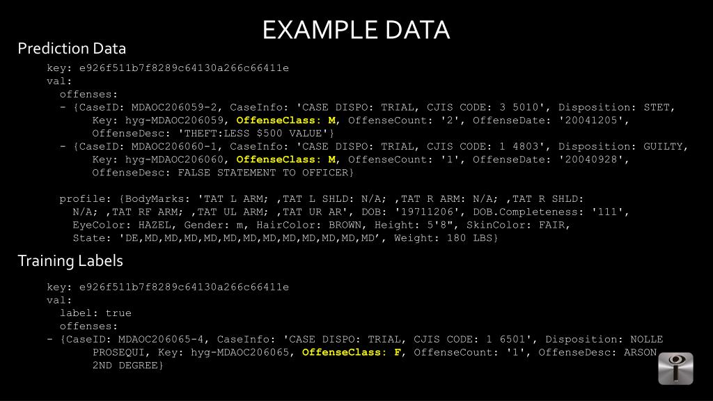 EXAMPLE DATA Prediction Data key: e926f511b7f8289c64130a266c66411e val: offenses: - {CaseID: MDAOC206059-2, CaseInfo: 'CASE DISPO: TRIAL, CJIS CODE: 3 5010', Disposition: STET, Key: hyg-MDAOC206059, OffenseClass: M, OffenseCount: '2', OffenseDate: '20041205', OffenseDesc: 'THEFT:LESS $500 VALUE'} - {CaseID: MDAOC206060-1, CaseInfo: 'CASE DISPO: TRIAL, CJIS CODE: 1 4803', Disposition: GUILTY, Key: hyg-MDAOC206060, OffenseClass: M, OffenseCount: '1', OffenseDate: '20040928', OffenseDesc: FALSE STATEMENT TO OFFICER} profile: {BodyMarks: 'TAT L ARM; ,TAT L SHLD: N/A; ,TAT R ARM: N/A; ,TAT R SHLD: N/A; ,TAT RF ARM; ,TAT UL ARM; ,TAT UR AR', DOB: '19711206', DOB.Completeness: '111', EyeColor: HAZEL, Gender: m, HairColor: BROWN, Height: 5'8", SkinColor: FAIR, State: 'DE,MD,MD,MD,MD,MD,MD,MD,MD,MD,MD,MD,MD’, Weight: 180 LBS} Training Labels key: e926f511b7f8289c64130a266c66411e val: label: true offenses: - {CaseID: MDAOC206065-4, CaseInfo: 'CASE DISPO: TRIAL, CJIS CODE: 1 6501', Disposition: NOLLE PROSEQUI, Key: hyg-MDAOC206065, OffenseClass: F, OffenseCount: '1', OffenseDesc: ARSON 2ND DEGREE}