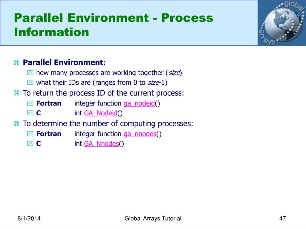 Parallel Environment - Process Information • Parallel Environment: • how many processes are working together (size) • what their IDs are (ranges from 0 to size-1) • To return the process ID of the current process: • Fortran integer function ga_nodeid() • C int GA_Nodeid() • To determine the number of computing processes: • Fortran integer function ga_nnodes() • C int GA_Nnodes() Global Arrays Tutorial
