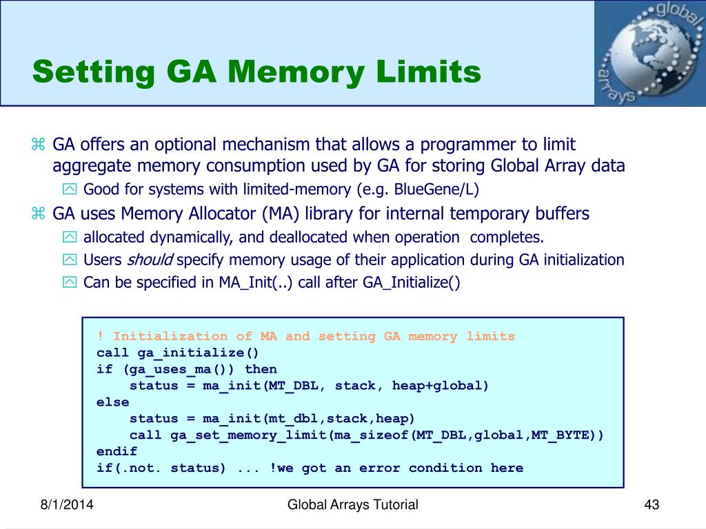 Writing, Building and Running GA programs • Writing GA programs • Compiling and linking • Running GA programs • For detailed information • GA Webpage • GA papers, APIs, user manual, etc. • (Google: Global Arrays) • http://www.emsl.pnl.gov/docs/global/ • GA User Manual • http://www.emsl.pnl.gov/docs/global/user.html • GA API Documentation • GA Webpage => User Interface • http://www.emsl.pnl.gov/docs/global/userinterface.html • GA Support/Help • hpctools@pnl.gov or hpctools@emsl.pnl.gov • 2 mailing lists: GA User Forum, and GA Announce Global Arrays Tutorial