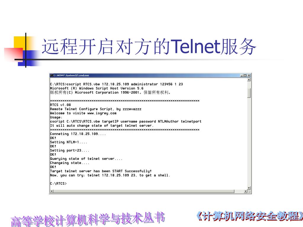 远程开启对方的Telnet服务 • 利用工具RTCS.vbe可以远程开启对方的Telnet服务,使用该工具需要知道对方具有管理员权限的用户名和密码。 • 命令的语法是:“cscript RTCS.vbe 172.18.25.109 administrator 123456 1 23”, • 其中cscript是操作系统自带的命令 • RTCS.vbe是该工具软件脚本文件 • IP地址是要启动Telnet的主机地址 • administrator是用户名 • 123456是密码 • 1是登录系统的验证方式 • 23是Telnet开放的端口 • 该命令根据网络的速度,执行的时候需要一段时间,开启远程主机Telnet服务的过程如图6-3所示。