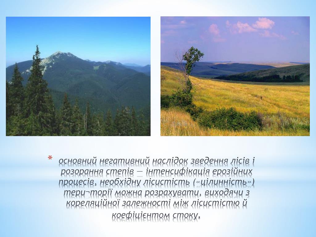 основнийнегативнийнаслідокзведеннялісів і розораннястепів — інтенсифікаціяерозійнихпроцесів, необхіднулісистість («цілинність») тери¬торіїможнарозрахувати, виходячи з кореляційноїзалежностіміжлісистістю й коефіцієнтом стоку.