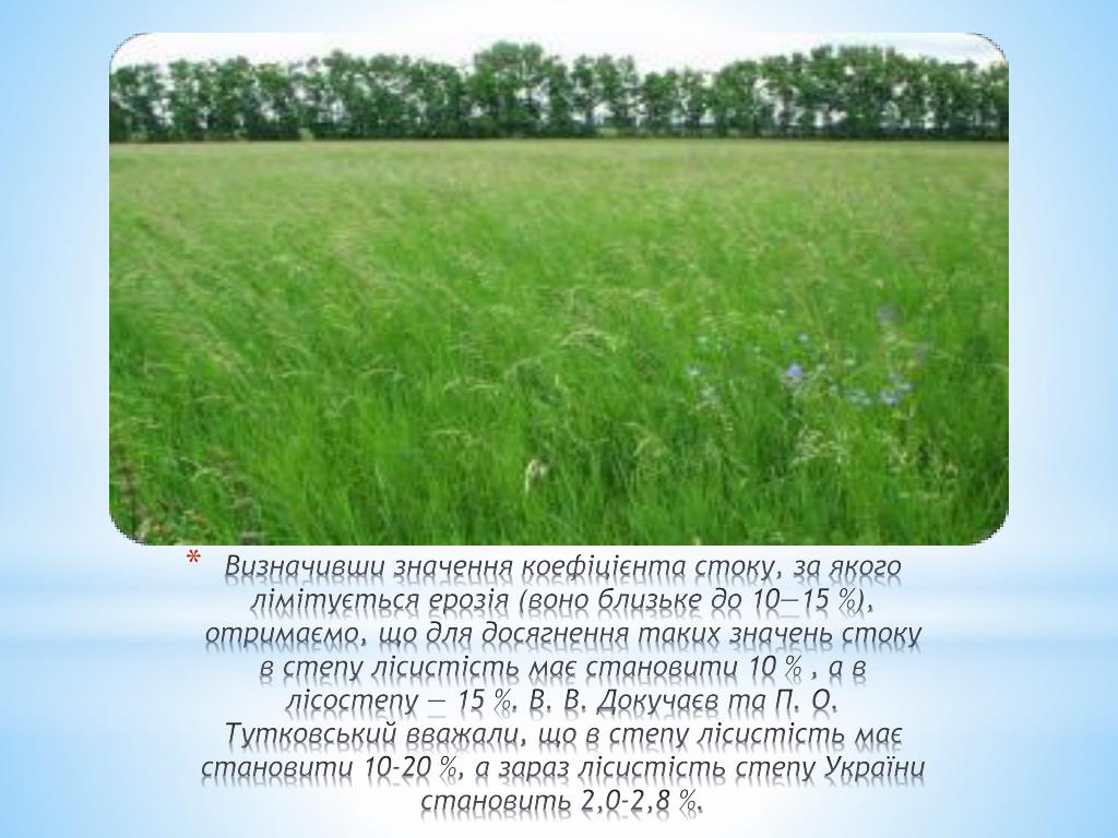 Визначившизначеннякоефіцієнта стоку, за якоголімітуєтьсяерозія (воноблизьке до 10—15 %), отримаємо, що для досягненнятаких значень стоку в степу лісистістьмаєстановити 10 % , а в лісостепу — 15 %. В. В. Докучаєв та П. О. Тутковськийвважали, що в степу лісистістьмаєстановити10-20 %, а зараз лісистість степу України становить 2,0-2,8 %.