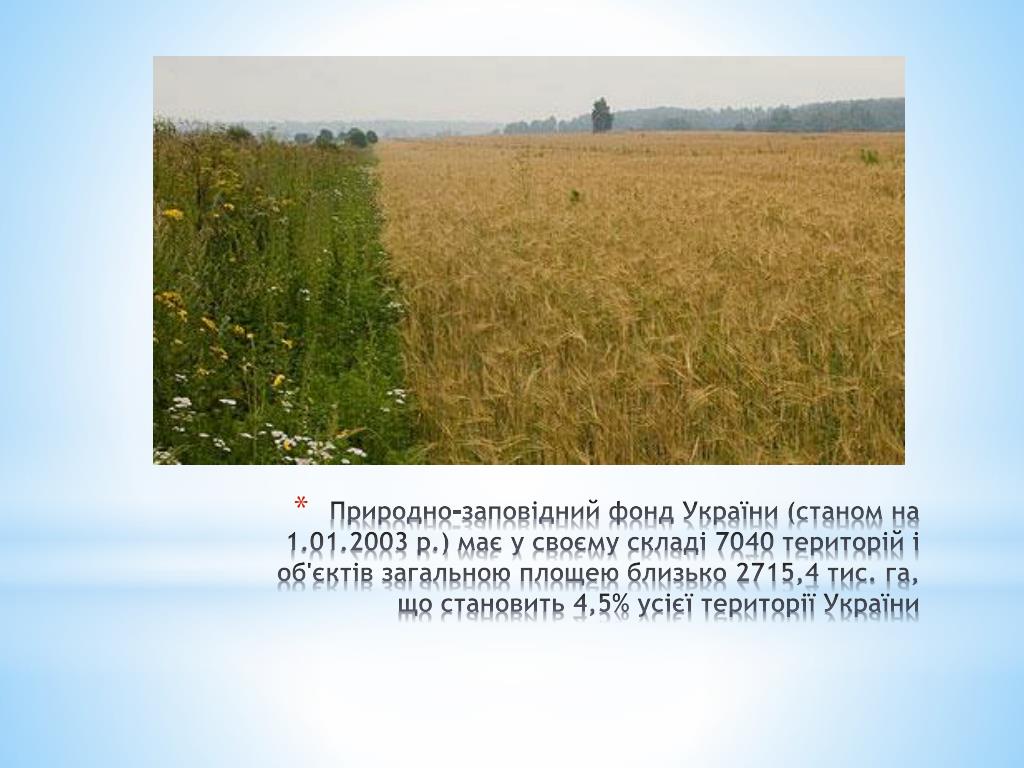 Природно-заповідний фонд України (станом на 1.01.2003 р.) має у своєму складі 7040 територій і об'єктів загальною площею близько 2715,4 тис. га, що становить 4,5% усієї території України