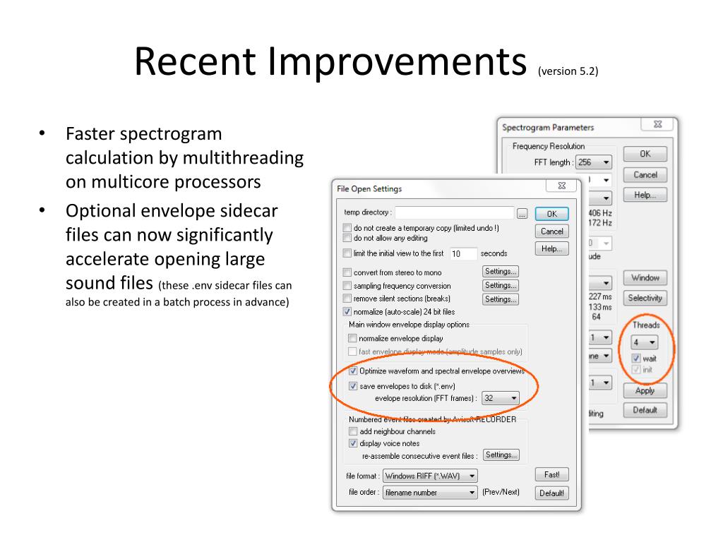 Recent Improvements (version 5.2) • Faster spectrogram calculation by multithreading on multicore processors • Optional envelope sidecar files can now significantly accelerate opening large sound files (these .env sidecar files can also be created in a batch process in advance)
