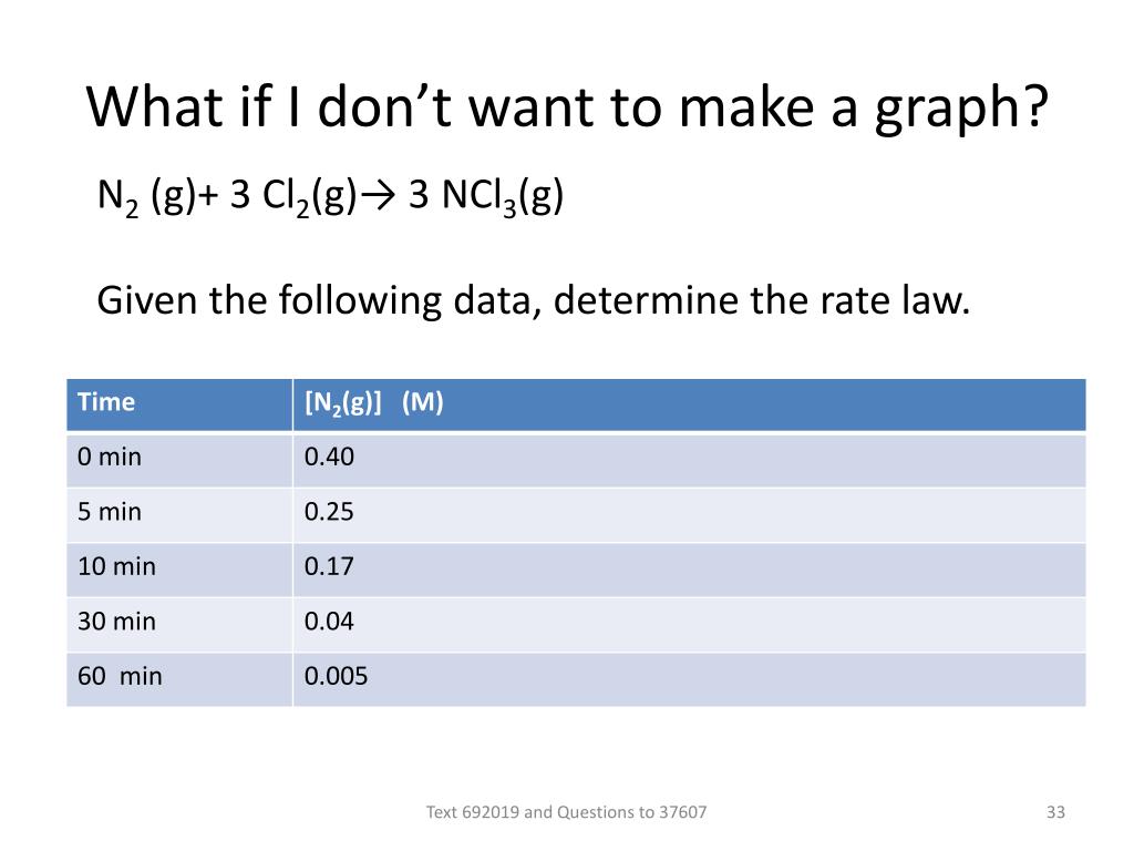 Integrated rate law – concentration at different times N2 (g)+ 3 Cl2(g)→ 3 NCl3(g) Given the following date, determine the rate law. Text 692019 and Questions to 37607