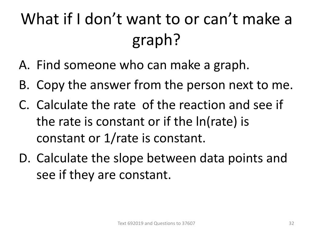 What if I don’t want to or can’t make a graph? • Find someone who can make a graph. • Copy the answer from the person next to me. • Calculate the rate of the reaction and see if the rate is constant or if the ln(rate) is constant or 1/rate is constant. • Calculate the slope between data points and see if they are constant. Text 692019 and Questions to 37607