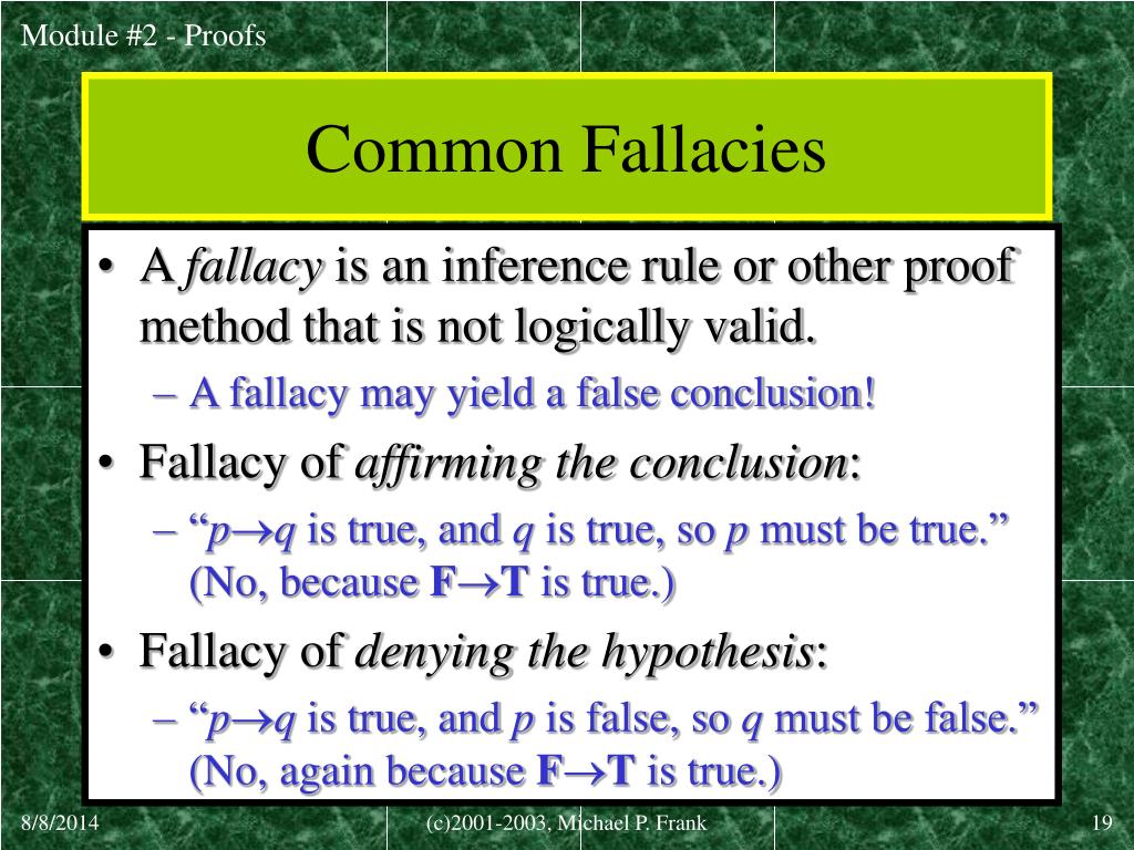 Common Fallacies • A fallacy is an inference rule or other proof method that is not logically valid. • A fallacy may yield a false conclusion! • Fallacy of affirming the conclusion: • “pq is true, and q is true, so p must be true.” (No, because FT is true.) • Fallacy of denying the hypothesis: • “pq is true, and p is false, so q must be false.” (No, again because FT is true.) (c)2001-2003, Michael P. Frank