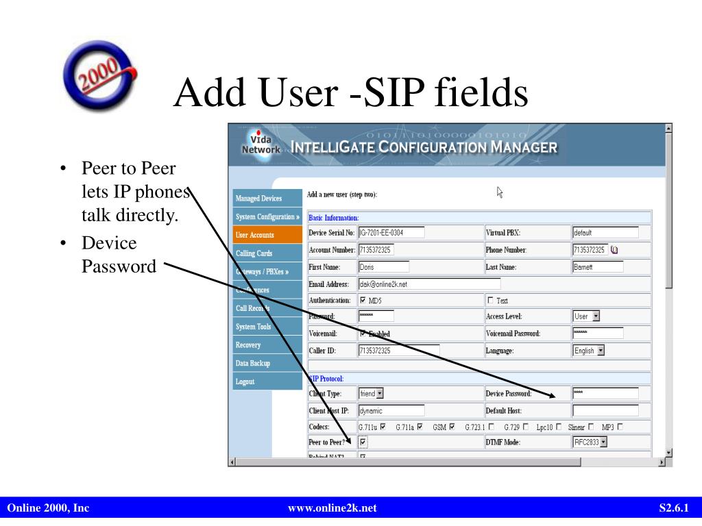 Add User -SIP fields • Peer to Peer lets IP phones talk directly. • Device Password Online 2000, Incwww.online2k.netS2.6.1