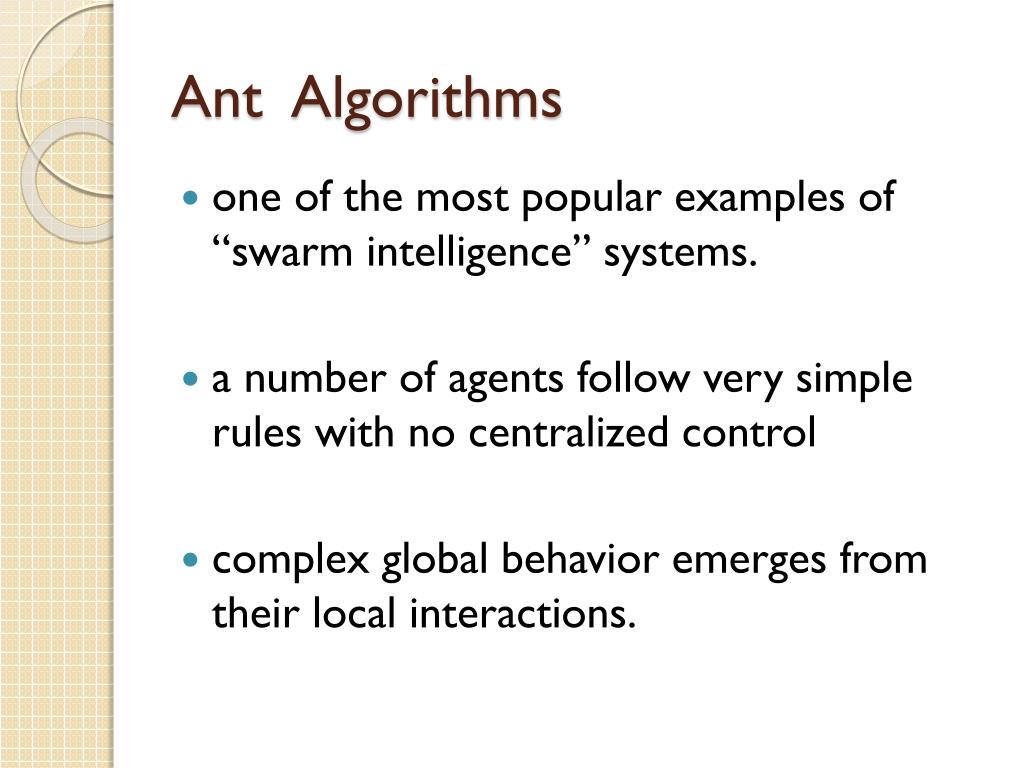 Ant Algorithms • one of the most popular examples of “swarm intelligence” systems. • a number of agents follow very simple rules with no centralized control • complex global behavior emerges from their local interactions.