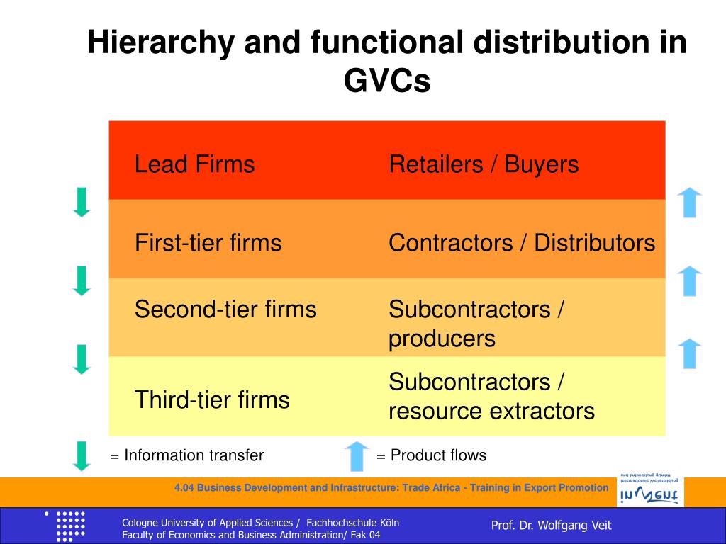 Hierarchy and functional distribution in GVCs Lead Firms Retailers / Buyers First-tier firms Contractors / Distributors Second-tier firms Subcontractors / producers Subcontractors / resource extractors Third-tier firms = Information transfer = Product flows 4.04 Business Development and Infrastructure: Trade Africa - Training in Export Promotion 4.04 Business Development and Infrastructure: Trade Africa - Training in Export Promotion 16 Cologne University of Applied Sciences / Fachhochschule Köln Faculty of Economics and Business Administration/ Fak 04 Prof. Dr. Wolfgang Veit
