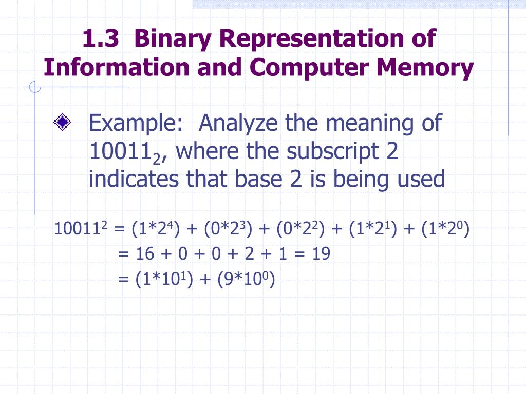 1.3 Binary Representation of Information and Computer Memory • Example: Analyze the meaning of 100112, where the subscript 2 indicates that base 2 is being used 100112 = (1*24) + (0*23) + (0*22) + (1*21) + (1*20) = 16 + 0 + 0 + 2 + 1 = 19 = (1*101) + (9*100)