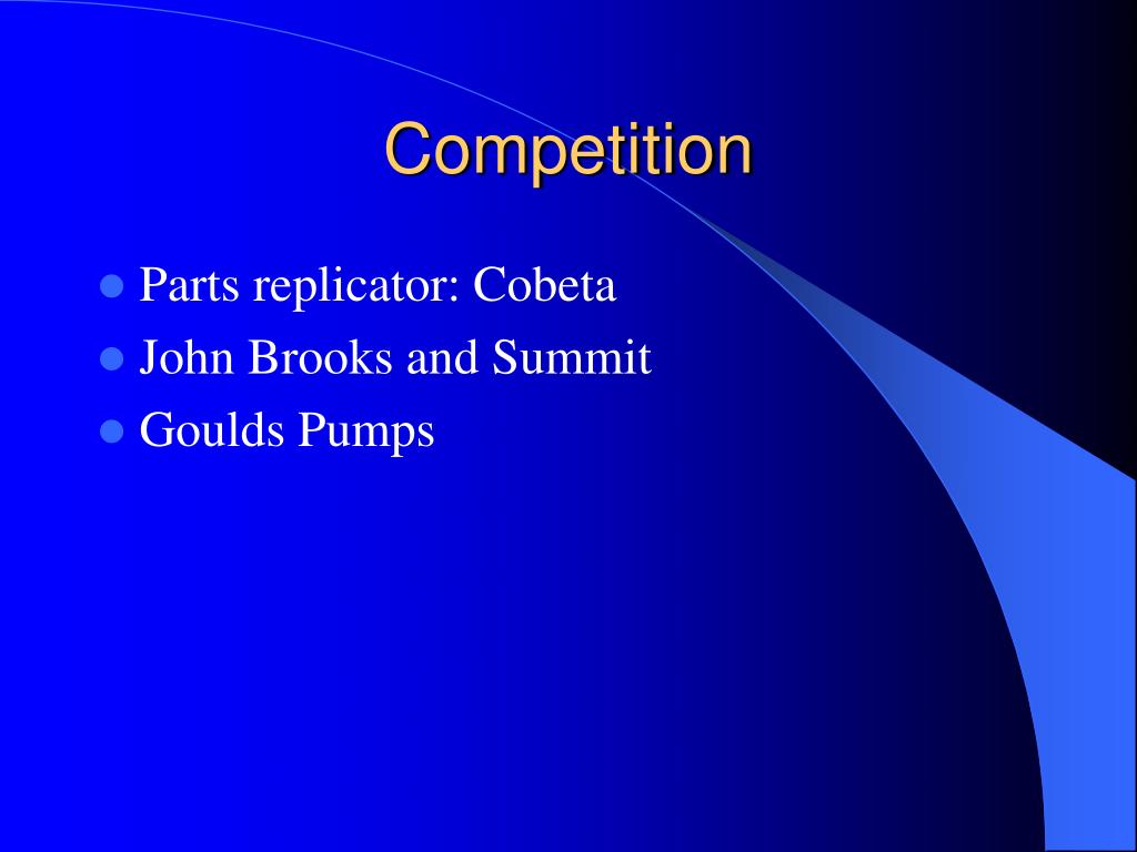 Competition • Parts replicator: Cobeta • John Brooks and Summit • Goulds Pumps