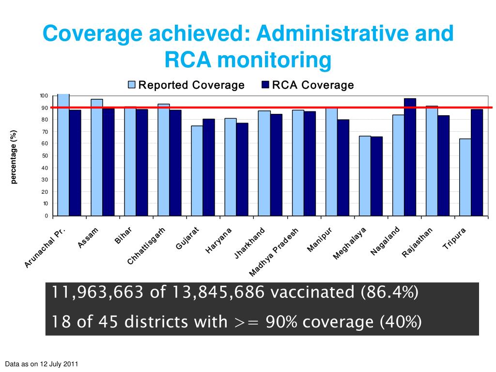 Coverage achieved: Administrative and RCA monitoring 11,963,663 of 13,845,686 vaccinated (86.4%) 18 of 45 districts with >= 90% coverage (40%) Data as on 12 July 2011